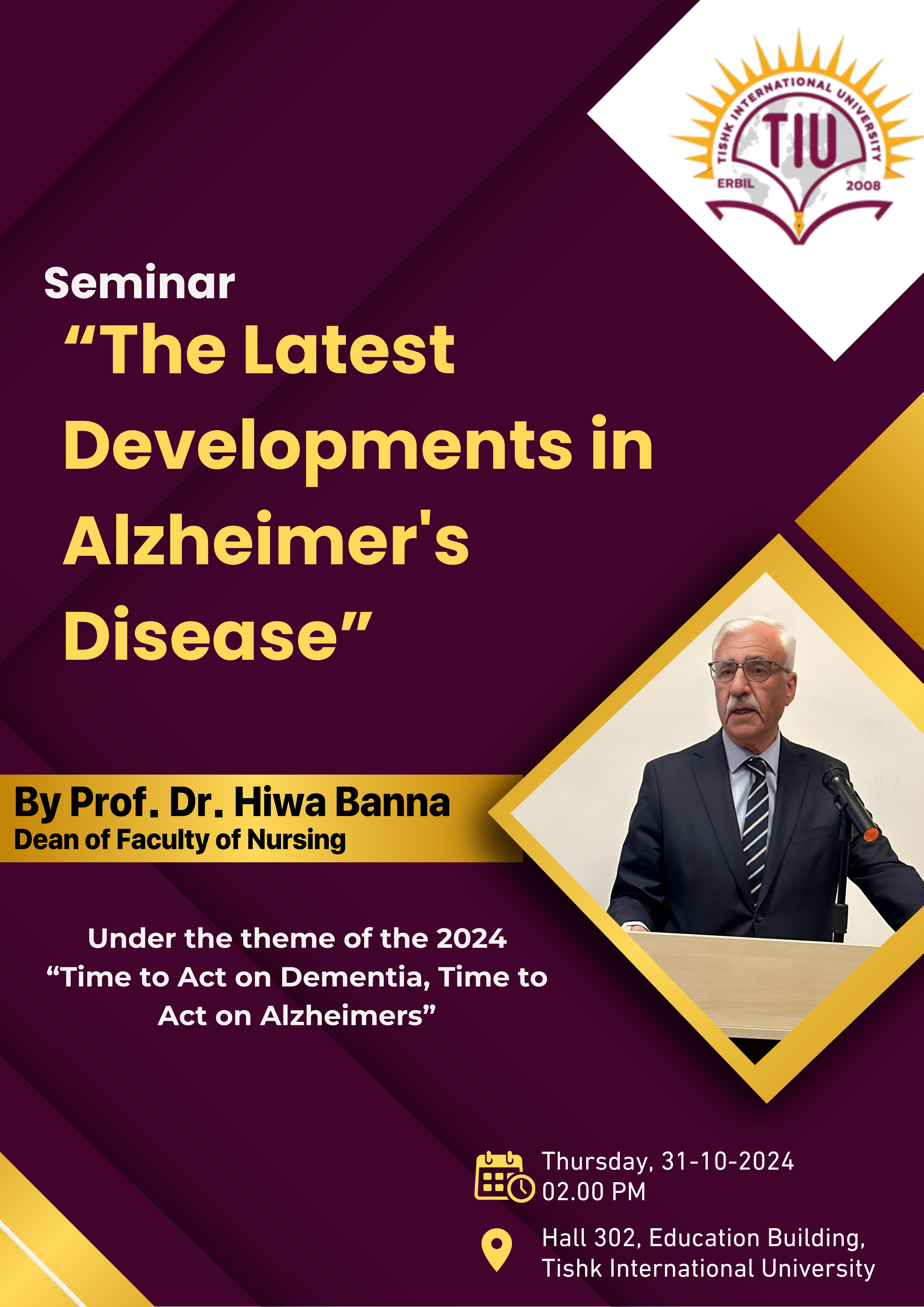 On 31st October 2024, the Faculty of Nursing at Tishk International University (TIU), organized a seminar entitled “The Latest Developments in Alzheimer’s Disease.” The seminar’s purpose was to bring participants up to date with recent discoveries relating to Alzheimer’s disease by underlining various milestones that have been reached in understanding diagnosis and possible prevention of this debilitating disease. This was indeed a useful update not only for faculty members and students but also for health professionals.